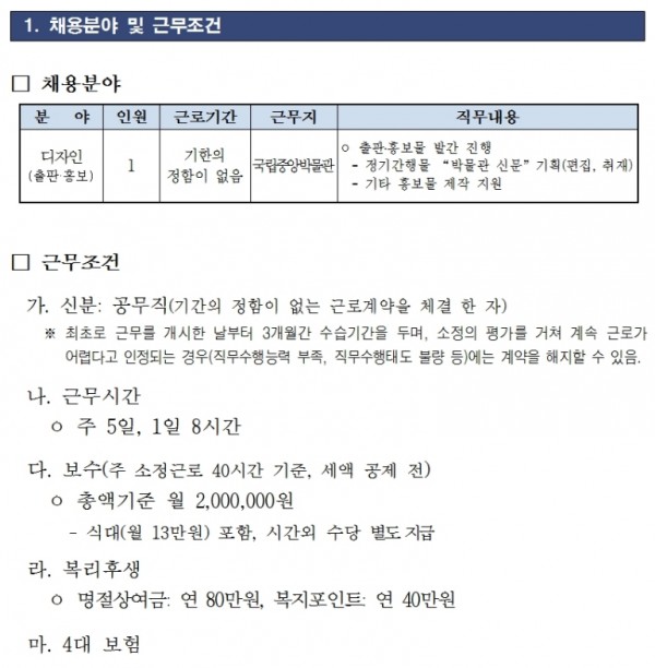 국립중앙박물관 디자인팀에서 근무할 공무직 근로자를 붙임과 같이 공개 모집 하오니 관심있는 분들의 많은 응시를 바랍니다.