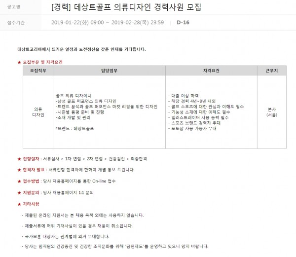 [경력] 데상트골프 의류디자인 경력사원 모집
